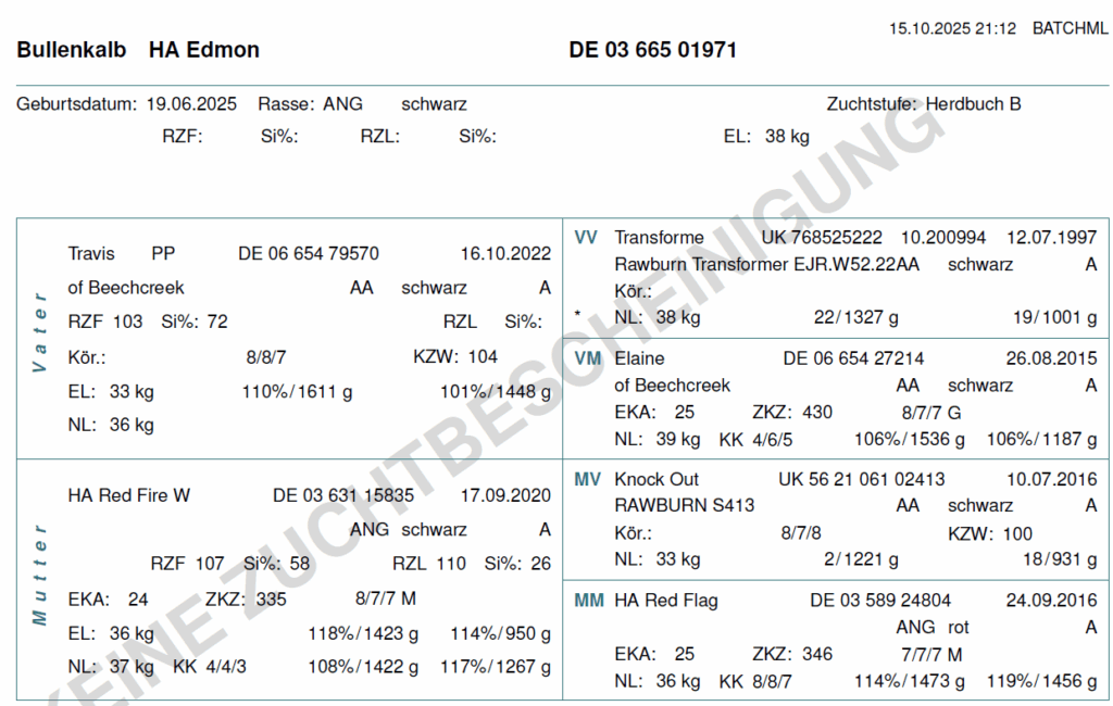 Bereits seit 2001 halten wir eine Deutschangus-Mutterkuhherde auf unserem Betrieb. Im Jahr 2006 sind durch einen Embryotransfer die ersten Aberdeen Angus Kälber bei uns auf dem Betrieb geboren (Embryos vom Rawburn). Im Jahr 2018 erfolgte ein Import vom Zuchtrindern aus Schottland (Idvies und Tonley) mit denen wir den Anteil an Aberdeen Angus Genetik in unserer Herde weiter ausbauen konnten. Seit 2015 werden ausschließlich Aberdeen Angus Bullen eingesetzt.